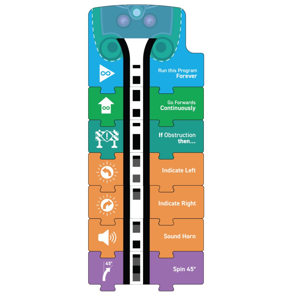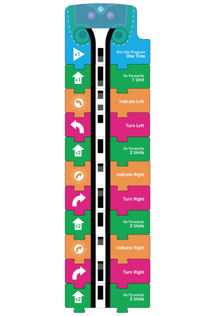 When driving, it’s important to indicate before turning a corner, so that other drivers and pedestrians can see that you are about to turn. Therefore, the orange ‘indicate’ blocks go before the pink ‘turn’ blocks.