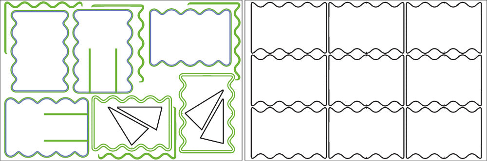 Cut the fins first (black outline), then kiss-cut (not all the way through) the blue lines to help with orienting the Layers when assembling. The green lines should be cut All the way through.