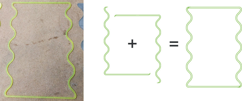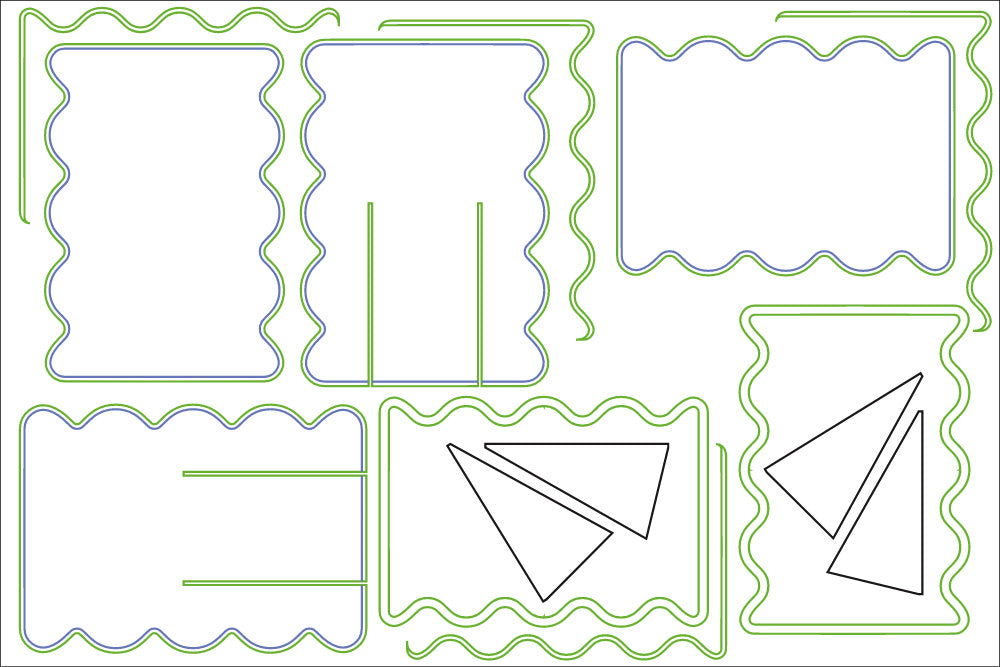 Below is an image of the file you will be downloading With two 600mm by 400mm borders to demonstrate how We anticipate it being used. The left contains two mirrors’ fluorescent frames on one acrylic sheet, and the right is four of the mirror itself on a single sheet of mirrored acrylic to show how multiple projects can be tessellated onto a single sheet to minimise waste.