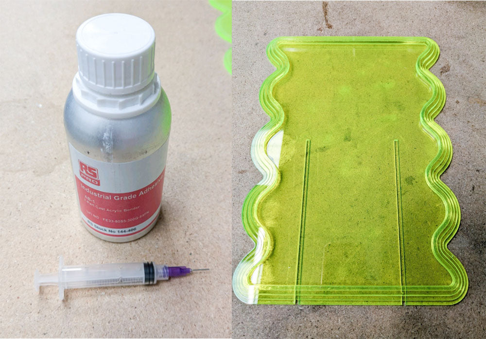 You are welcome to use another adhesive of your choice, however, we have used a plastic welding adhesive in order to minimise the amount of frosting in the clear acrylics. Superglue would compromise the fluorescent acrylic in this way, for instance.