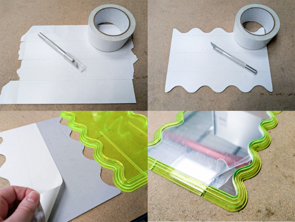 Adhesive use here should be considered also. We have Opted for double-sided sticky tape since the hold that is needed is not structural or under stress, and any strong glues, like superglue or a plastic weld, could damage the mirror coating on the back of the mirror acrylic sheet. It can also be helpful to leave the film on until after this step in order to protect the front surface.