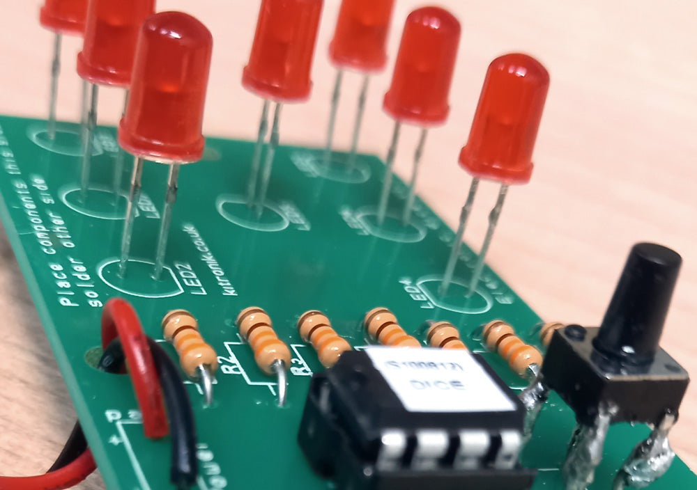 Start by soldering the dice kit together, making sure that the LEDs and switch sit higher than the IC Socket and they are all the same distance off the board. You will need to use the legs that have been cut off the resistors to extend the legs on the switch.