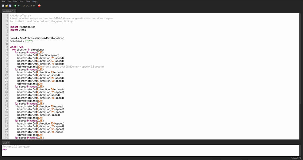 We’ve recently launched two motor driver boards for the Raspberry Pi Pico, the Kitronik Motor Driver Board for Raspberry Pi Pico and the Kitronik Robotics Board for Raspberry Pi Pico. We’ve also just created a GutHub repository for each board with MicroPython example code to make the job of using the boards as simple possible. This guide contains everything you need to get up and running, including a beginners guide video for using the Thonny editor with MicroPython.