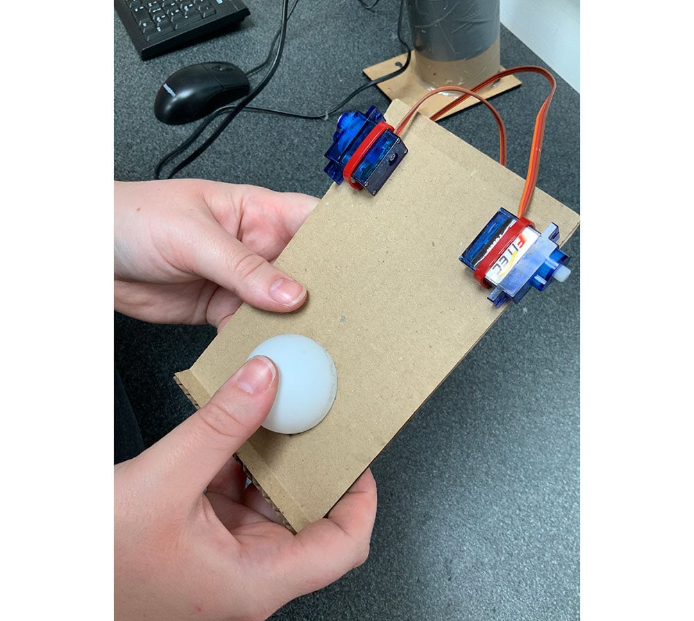 Code your micro:bits! This make uses two: one as a remote and one to output the signals as motion on the servos.