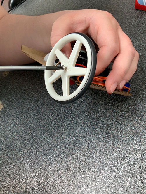 Before you screw the wheels on, simply push them on to the output shafts and make sure your continuous servos are adjusted to go at the same speed. This can be done by adjusting the small screws on the back of the servos, as per this blog.