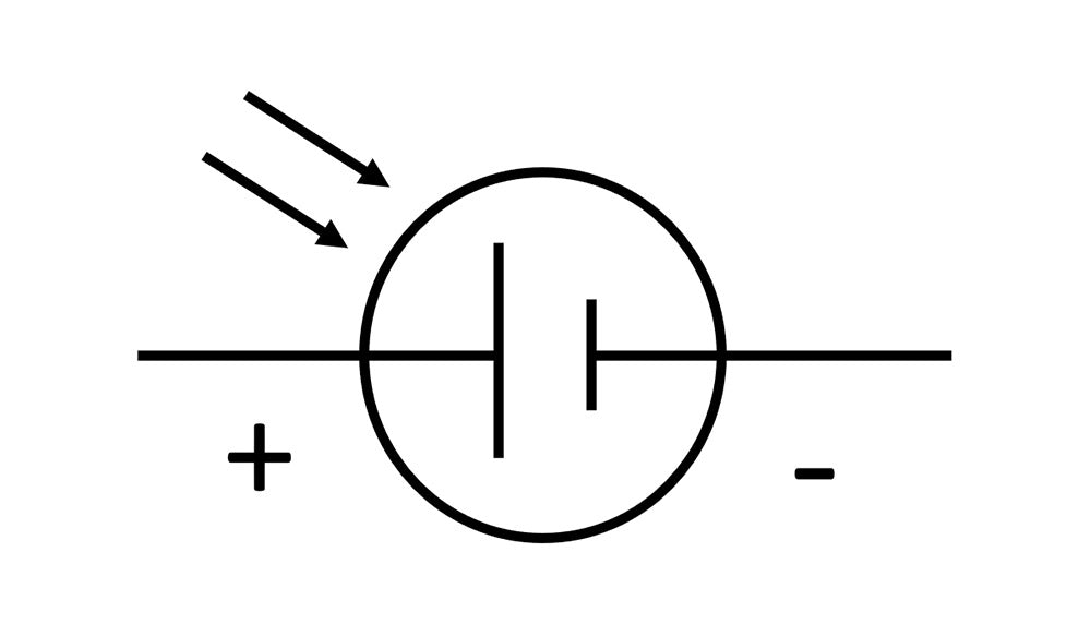 Combines elements of the circuit symbol for a battery, and the circuit symbol for a light sensitive device. When light hits the junction, the absorption of its energy liberates electrons, and these can flow to produce a current in a circuit. Diodes and transistors (both contain P-N junctions) are sensitive to light, hence most electronic components are packaged into light proof ‘chips’ as we want to keep the light out to prevent spurious operation.