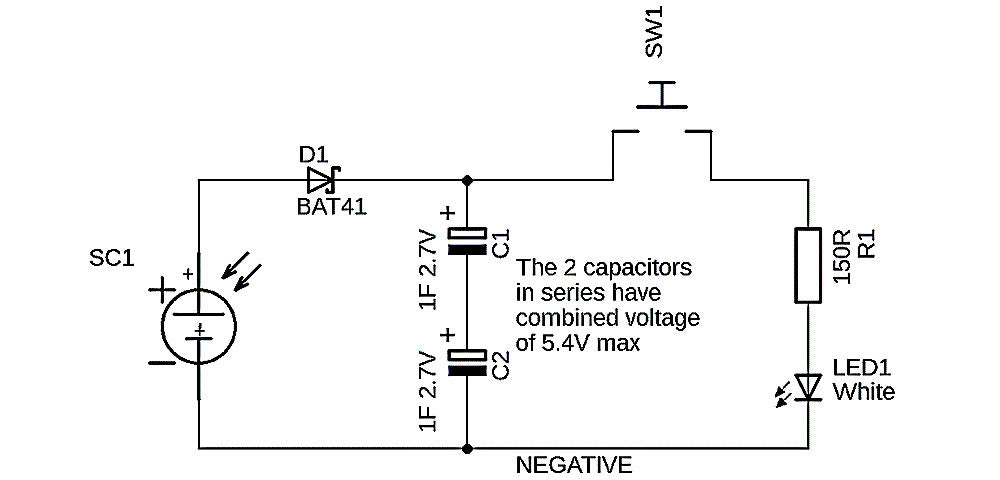 The Kitronik Solar Torch (2175) stores its energy in a pair of capacitors. Its circuit diagram is shown in Figure 6. The capacitors (C1 and C2) are charged by the solar cell, and then that energy can be used to light the LED. To prevent the solar cell ‘wasting’ the stored energy, there is a Schottky blocking diode in the circuit (D1). Schottky diodes have a low voltage drop, which means that less of the solar energy is wasted, and they are common in renewable power electronics.