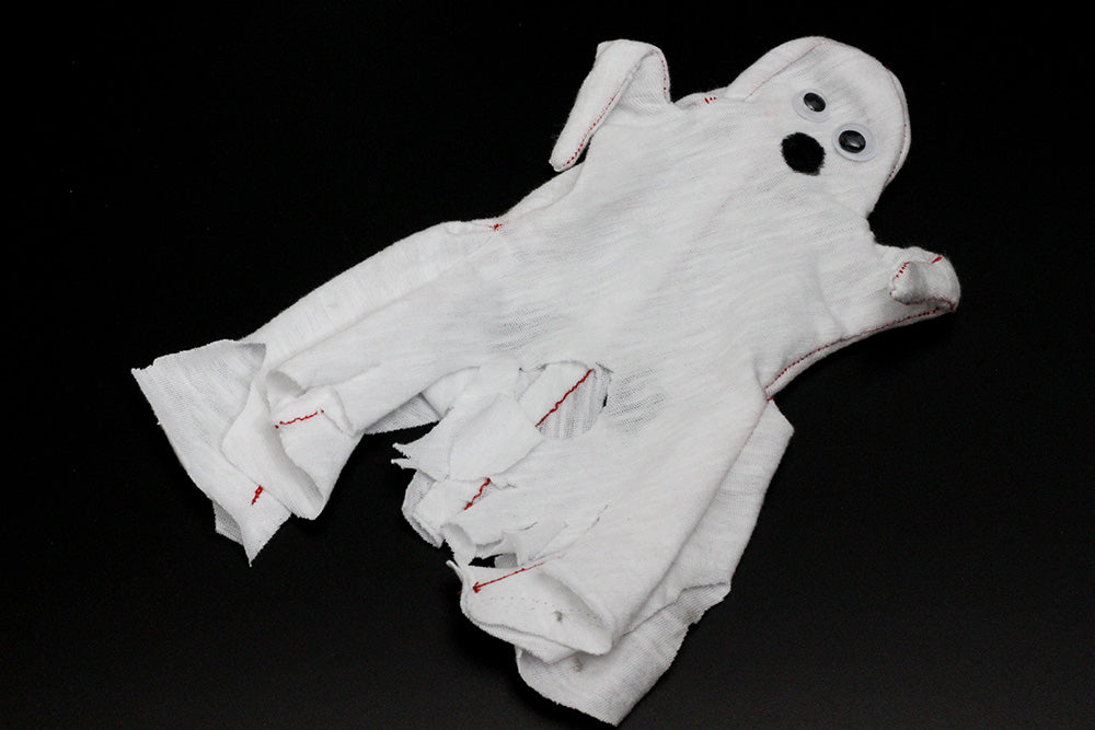 Lastly, cover with a costume! I made a tailored ghost-sheet-costume on a sewing machine, then added googly eyes and a marker pen mouth.