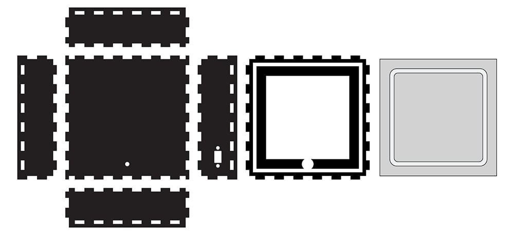 This design is in two parts. The box panels with finger joints will form the back of the mirror. We cut this from our Black Value Acrylic, which fits five makes per 600mm x 400mm sheet. The grey square with the engraved rectangle is the mirror panel, which we cut from Silver Mirrored Value Acrylic. Each 600mm x 400mm sheet fits 24 of these.