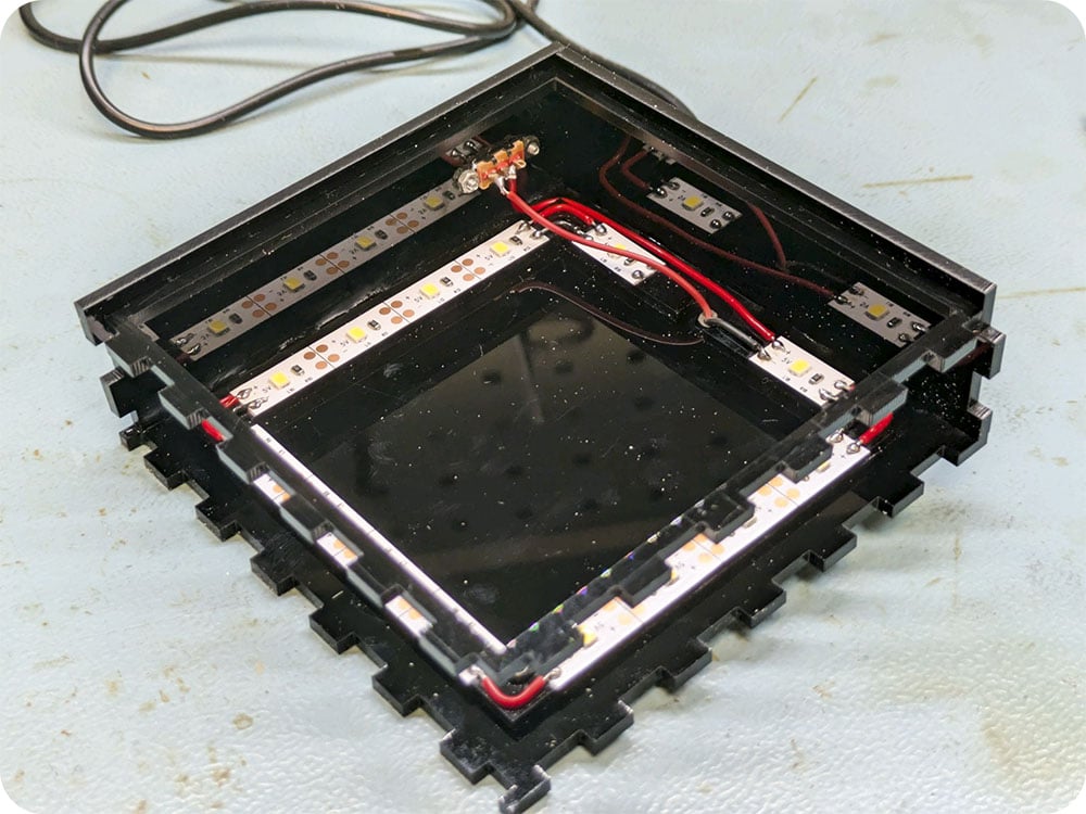Assembling the LEDs on the riser before sticking it into the enclosure makes soldering a lot easier. Use the adhesive backing on the LEDs to stick them down to the riser, and then solder the corners together, making sure to attach positive to positive and negative to negative, using small pieces of wire.