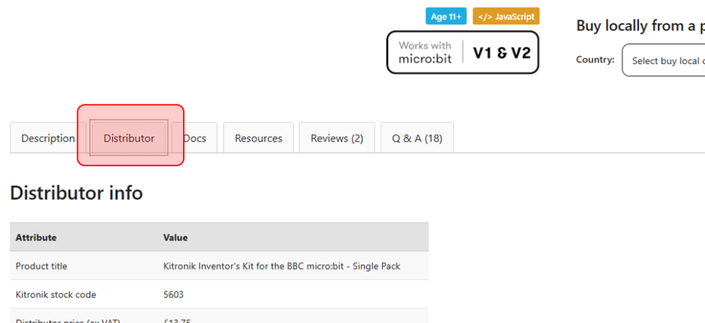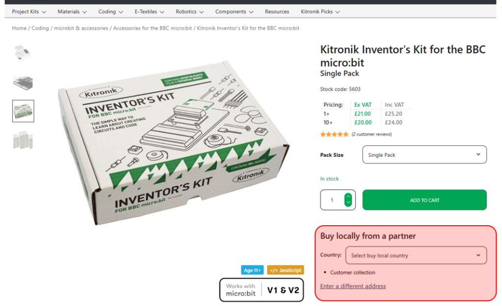 • Distributor account has been tagged to allow “buy locally” (Kitronik to do).