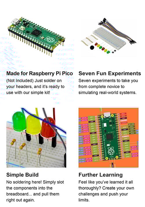 - The Raspberry Pi Pico is NOT supplied with this kit. There is a version of this kit that has a Pico included, available here.