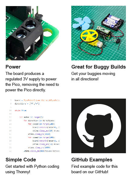 - A compact yet feature-packed board designed to sit at the heart of your Raspberry Pi Pico robot buggy projects.