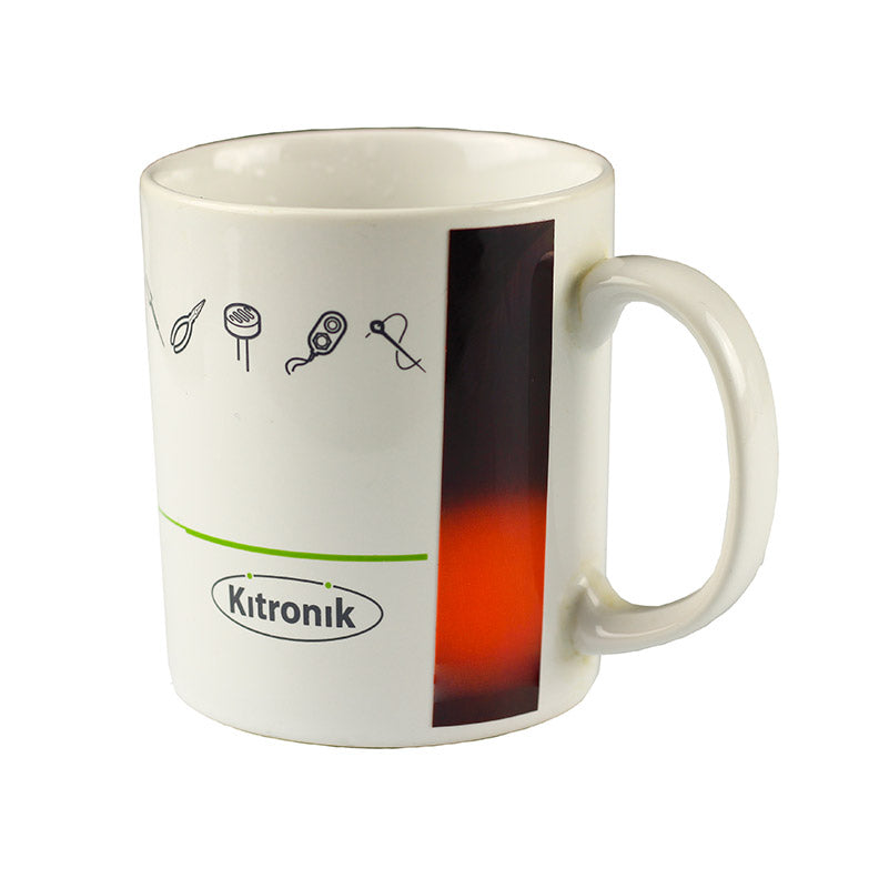 This versatile strip utilises materials with thermochromic properties to change colour depending on the temperature of the surface that it is attached to. As such this can then be used as a quick visual reference for a vessel containing a heated liquid, over time the temperature will change and the colour will change accordingly. There are a number of coffee cups on desks at Kitronik now sporting such a strip…