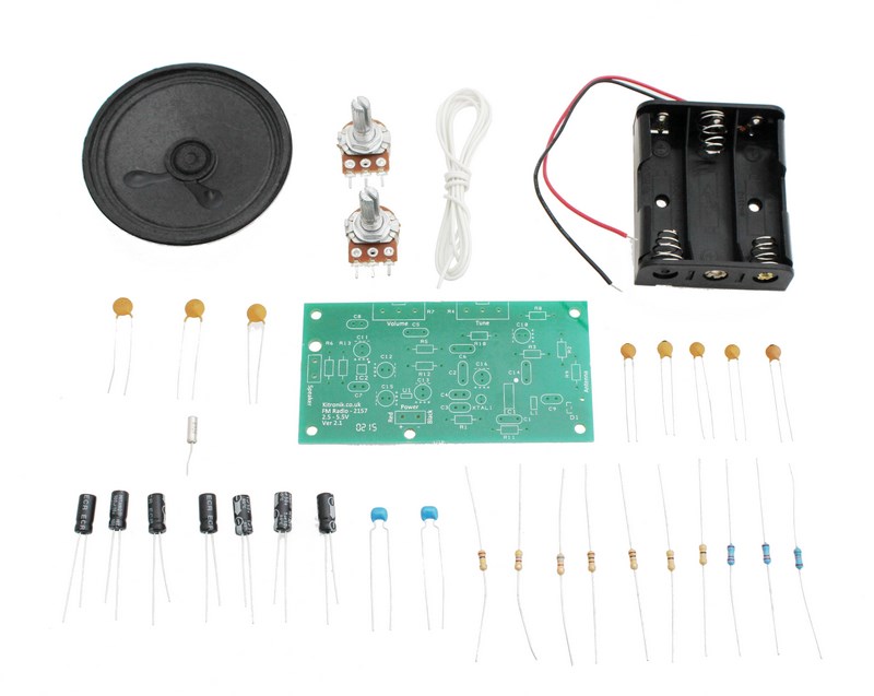 The radio has controls for tuning and adjusting the volume. The circuit includes an audio amplifier and output is via a 66mm diameter speaker that is supplied with the kit.