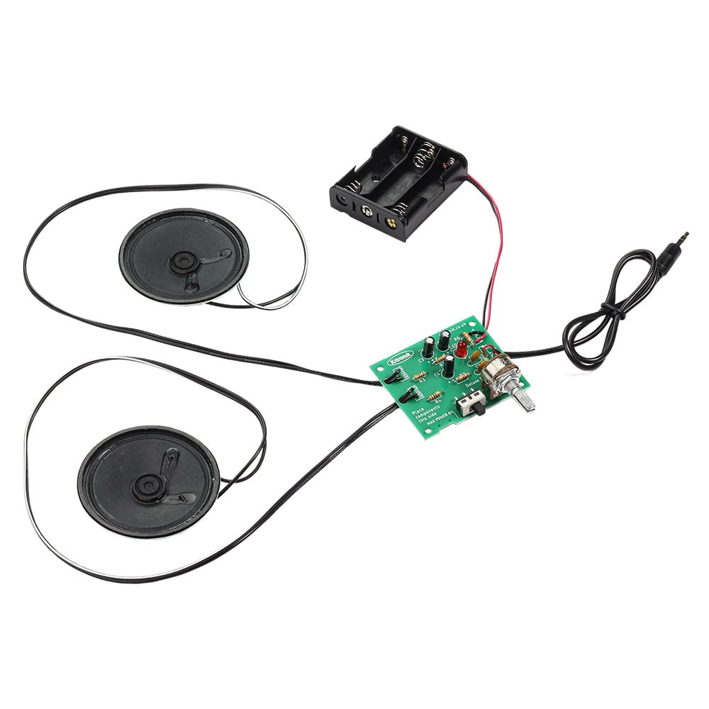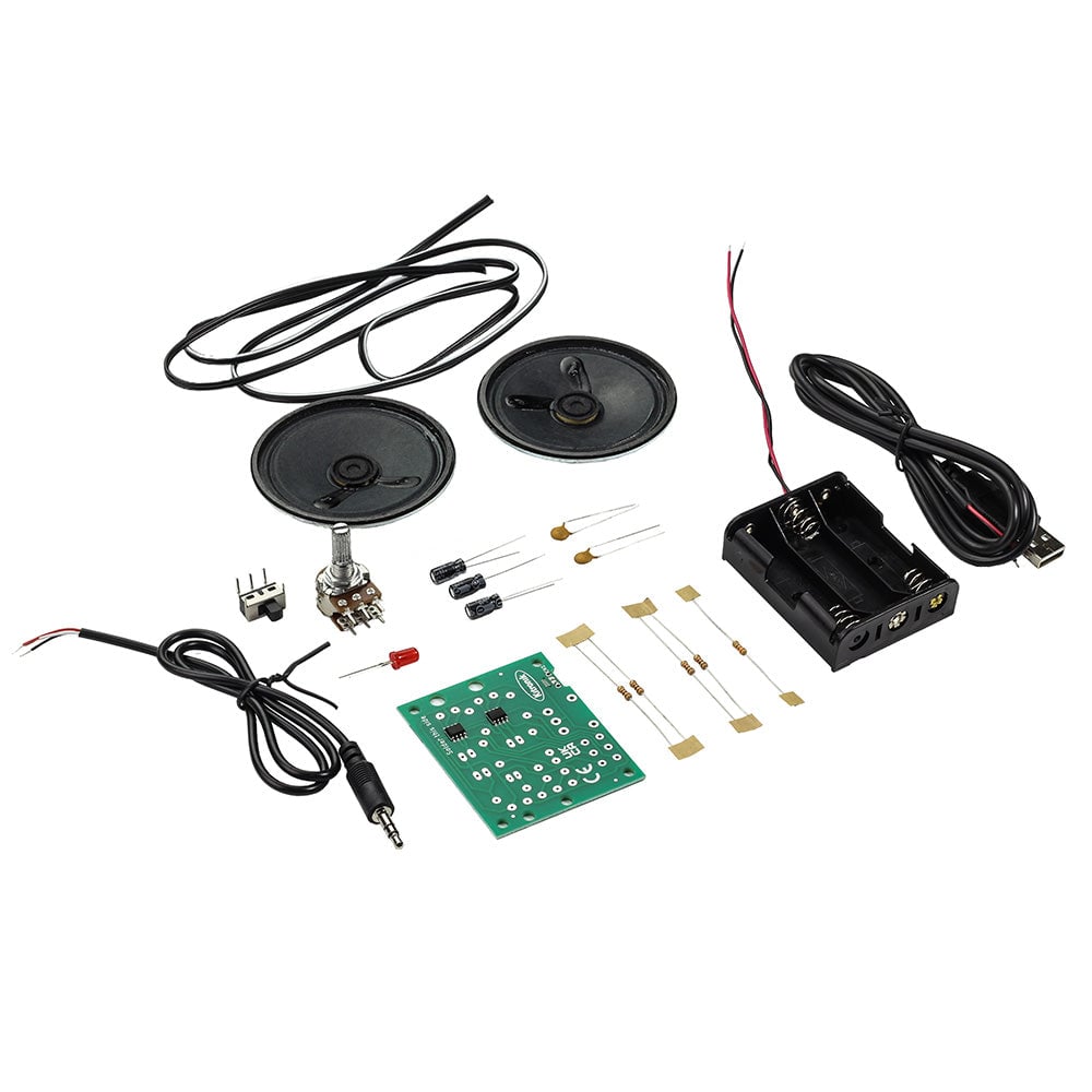 This is the Kitronik deluxe stereo audio amplifier kit. This kit can be used with any personal stereo equipment, including MP3 players and Mobile devices, such as tablets and phones with a 3.5mm jack socket. The M3 mounting holes in each of the corners make it straightforward to attach the kit firmly to an enclosure. As with all of our kits, we have provided teachers with full documentation that can be used to deliver high-quality lessons. They can be downloaded from the foot of the product description. The kit can be used in the classroom to teach electronics and product design.