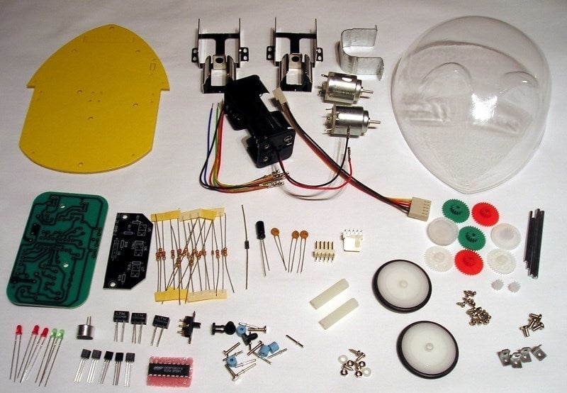 A complete kit of electronic and mechanical parts to build a line following robot. Three photosensors are used as the robots ‘eyes’ to allow it to follow a black line, drawn on paper or taped to the floor.