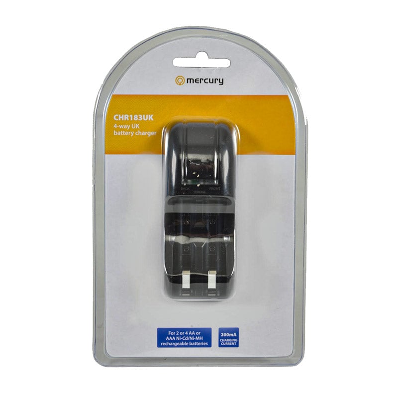 The 4 way Mercury CHR183UK battery charger is a compact plug-in charger that is ideal for professional and everyday use. It allows you to charge any standard AA or AAA Ni-Cd/Ni-MH rechargeable batteries, and you may charge 2 or 4 batteries at a time.