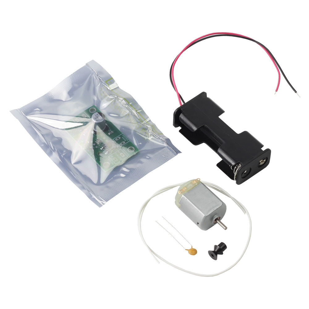 - This kit requires some soldering. The battery holder and motor both need to be soldered to the PCB, and the 10nF capacitor soldered to the motor.