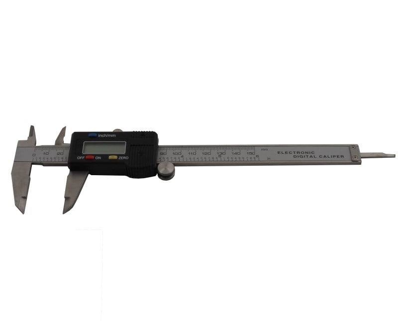LCD readout digital caliper with a capacity of 6″/150mm, manufactured from hardened stainless steel.