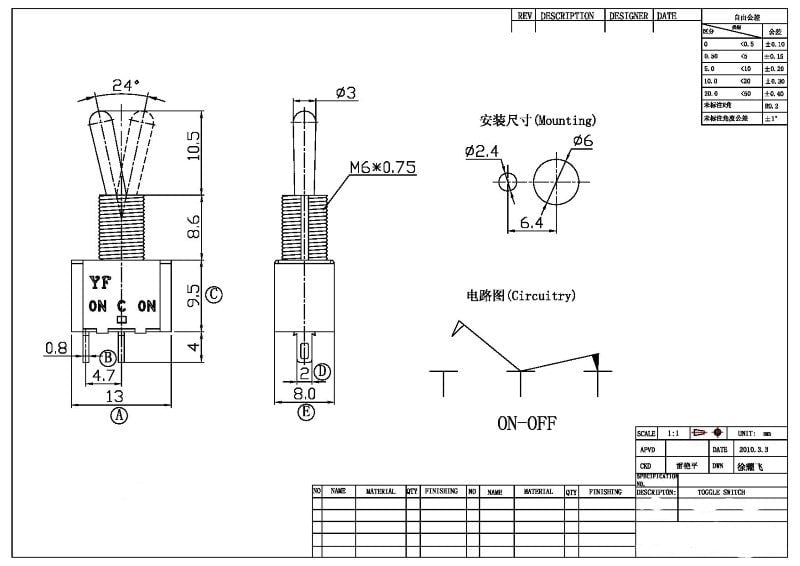 • Single pole single throw toggle switch.