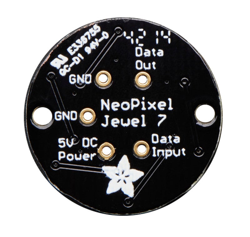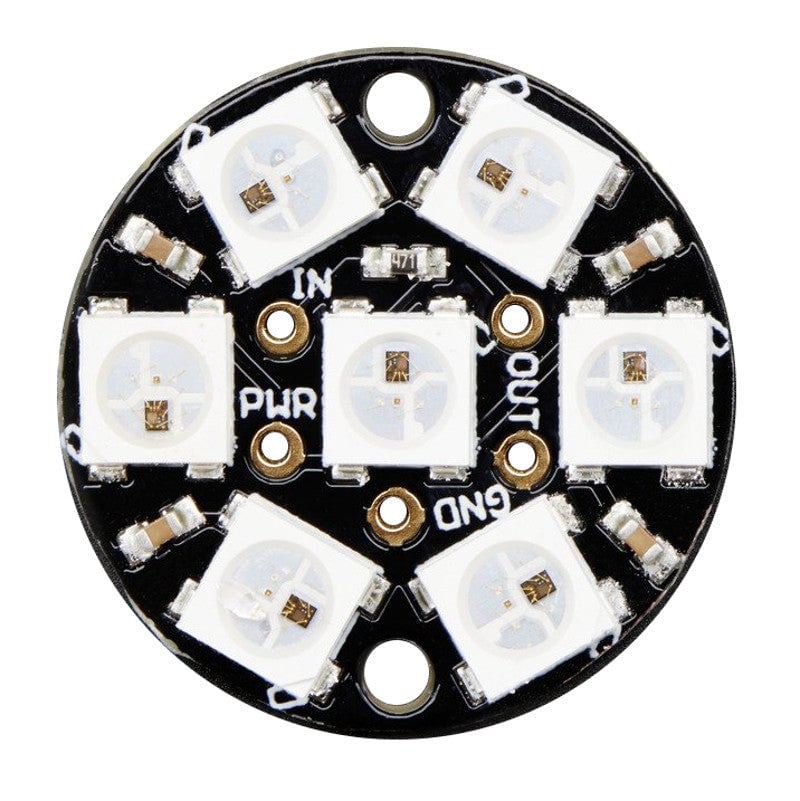This NeoPixel Jewel has seven tiny 5050 (5mm x 5mm) smart RGB LEDs onto a round PCB with mounting holes. Use only one microcontroller pin to control as many as you can chain together!
