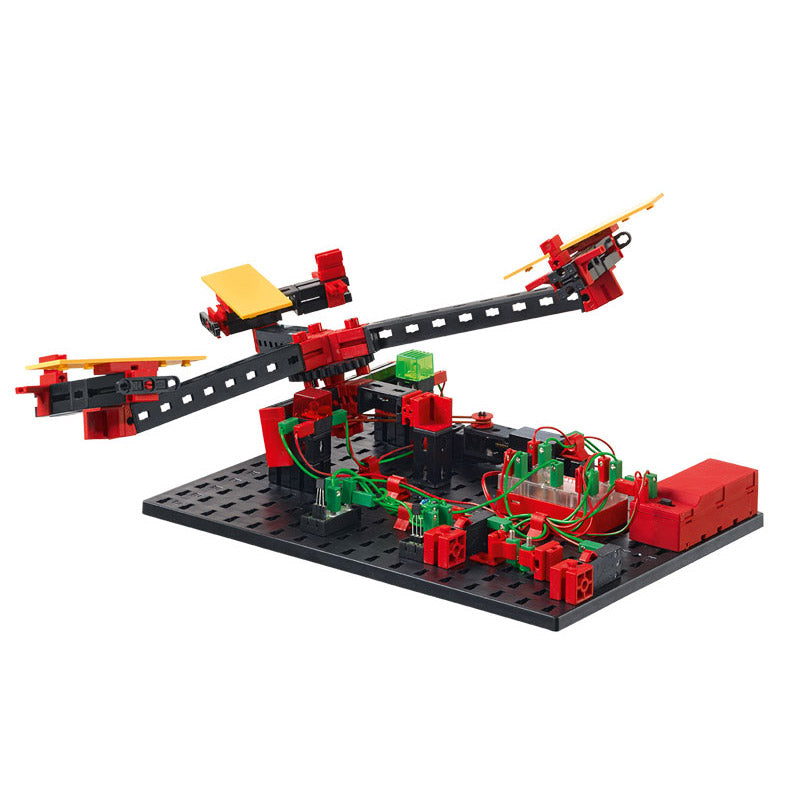 Simple electrical circuits, series and parallel circuits, electronic circuits with transistors, capacitors, resistors, and LEDs. This educational construction set teaches students the basic principles of electronics step by step. The Electronics Module, a controller with 16 set programs, has 2 motor outputs, 3 analog inputs for sensors and a potentiometer to control the speed of a motor. From a simple flashlight to a swinging boat ride, a flashing blinker and a controllable fan, this construction set uses lots of exciting working models to teach students the basic principles of electronics in a competent, lasting way. Just like all fischertechnik Education construction sets, Electronics can be used in supervised or unsupervised learning.