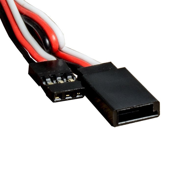 This 30cm servo extension cable has three 22-AWG wires joining a male Futaba J connector and a female JR connector. Since a female JR connector can be plugged into a male Futaba J connector, each end of the cable is compatible with both Futaba and JR-style connections; this cable will work as an extension cable in either system or as an adapter between systems, and it is compatible with almost all of the servos we sell (you can assume our servos have female JR connectors unless the servo’s product page specifically says otherwise).