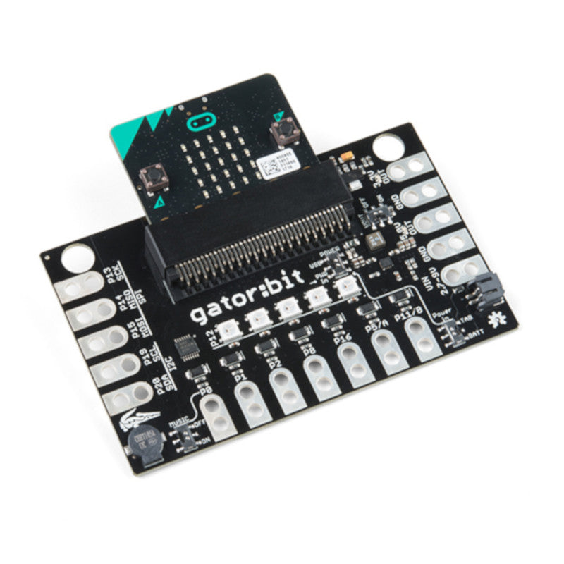 The gator:bit is an all-in-one “carrier” board for your microbit that provides you with a fully functional development and prototyping platform. Almost every pin on the micro:bit is broken out to pads that alligator (or crocodile, if you prefer) clips can connect to so you can get the most out of it! Whether it is data visualization using the five on-board addressable LEDs, capacitive touch sensing on pins 0, 1, & 2, or creating musical works of art using the built-in speaker we’ve got it covered with the SparkFun gator:bit!