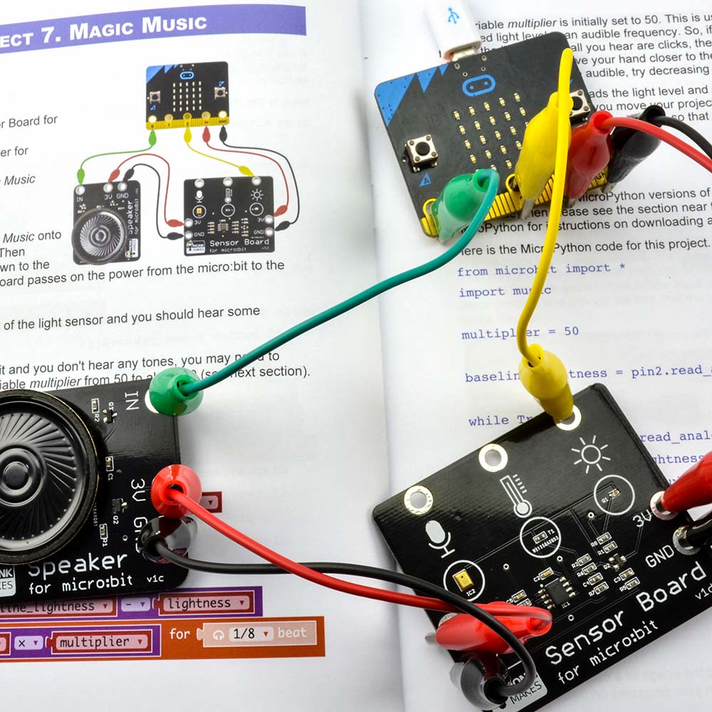 The instruction book leads you through getting started with your micro:bit and then building the following projects: Movement Alarm, Lighthouse, Shout-o-meter, Thermometer, Fan speed Controller, Automatic Fan and a Theramin-like ‘Magic’ Musical Instrument.