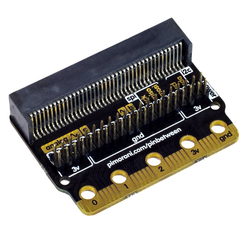 The 40-pin male header on Pinbetween lets you to connect extra bits to your micro:bit while using an edge-connector add-on such as our motor driver board for micro:bit.