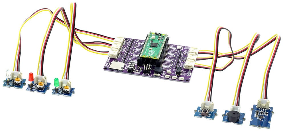 Excellent board – get programming in 5 minutes – plug in a Pico, connect to a PC and you’re up and running. No need to wire anything up as LEDs, buttons, buzzer are all on the board. Grove connectors can be used to connect non-Grove peripherals as well if you’re handy with a soldering iron.