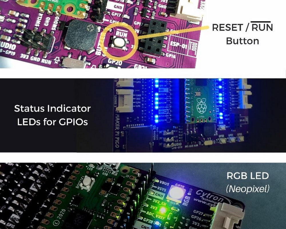 - Each GPIO pin has an LED indicator for quick visual troubleshooting.