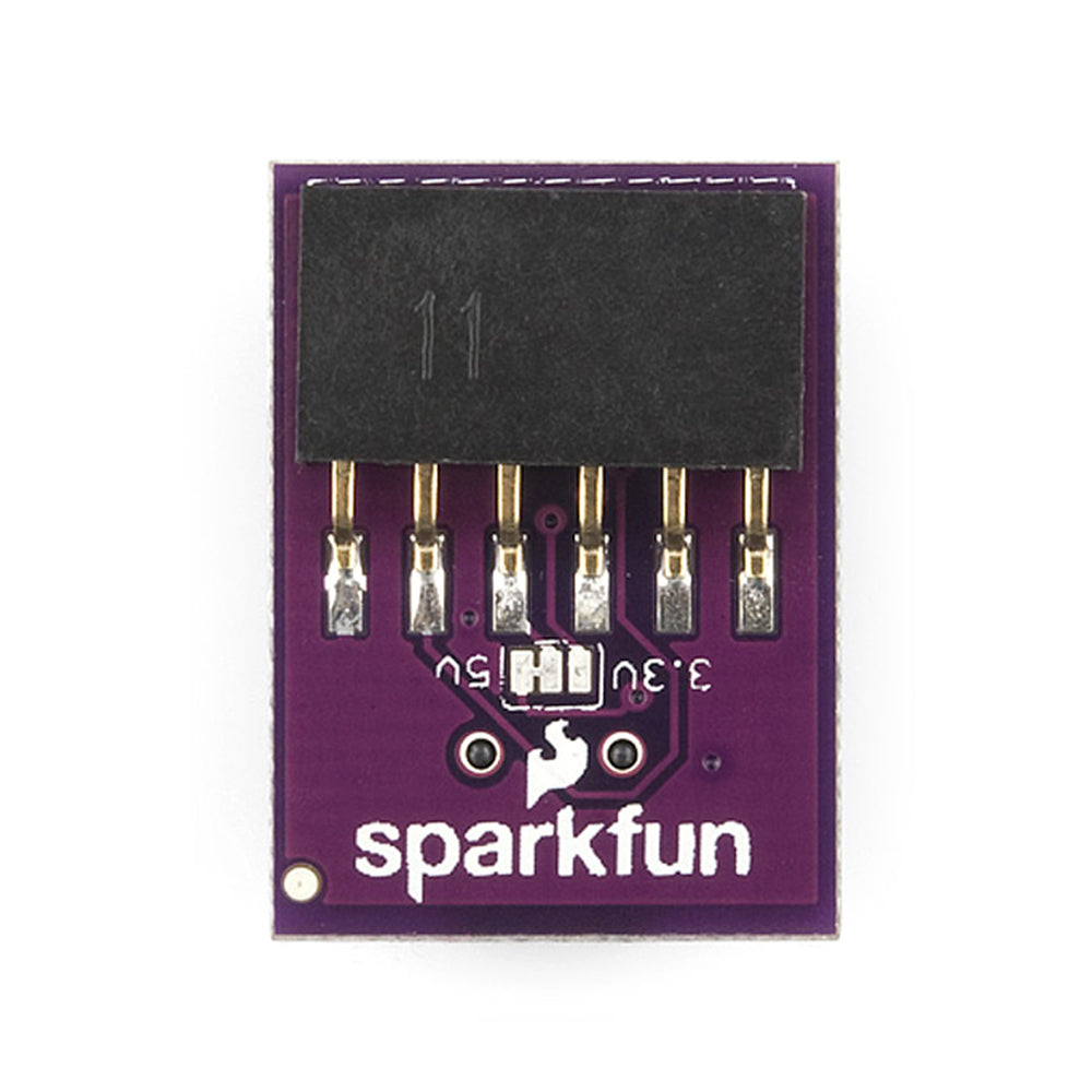 One of the nice features of this board is a jumper on the back of the board that allows the board to be configured to either 3.3V or 5V (both power output and IO level). This board ship as 5V, but you can cut the default trace and add a solder jumper if you need to switch to 3.3V.