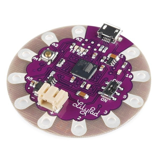 LilyPad is a wearable e-textile technology developed by Leah Buechley and cooperatively designed by Leah and SparkFun. Each LilyPad was creatively designed to have large connecting pads to allow them to be sewn into clothing. Various input, output, power, and sensor boards are available. They’re even washable!