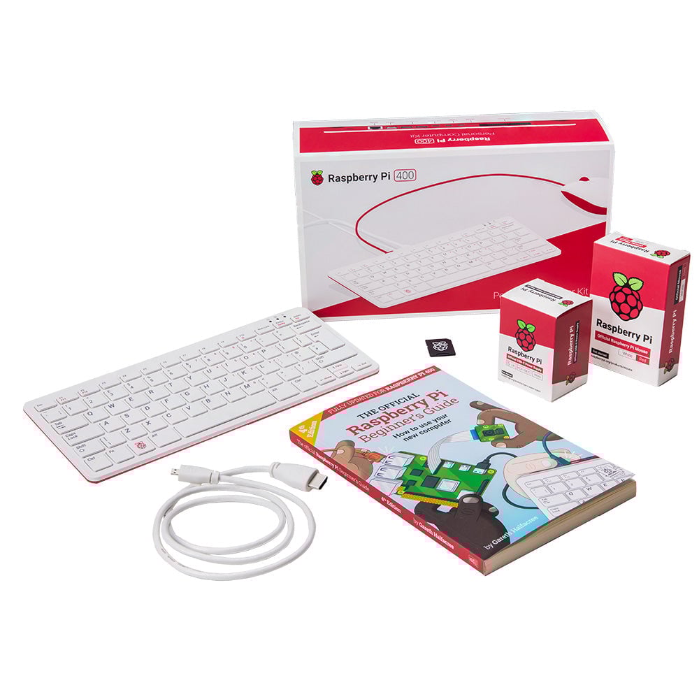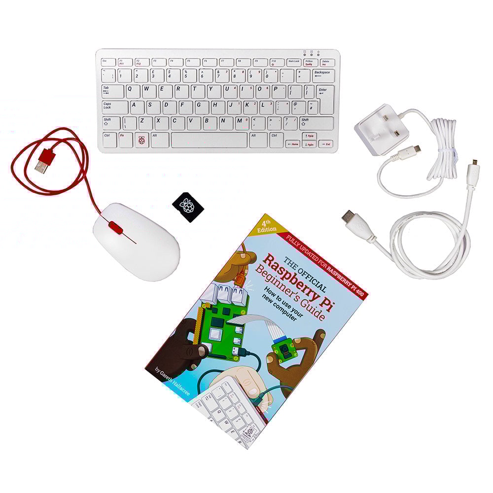 - The kit includes Raspberry Pi 400, power supply, HDMI cable, preloaded 16GB microSD card with Raspberry Pi OS installed, mouse, and Beginner guide. Just add a monitor!