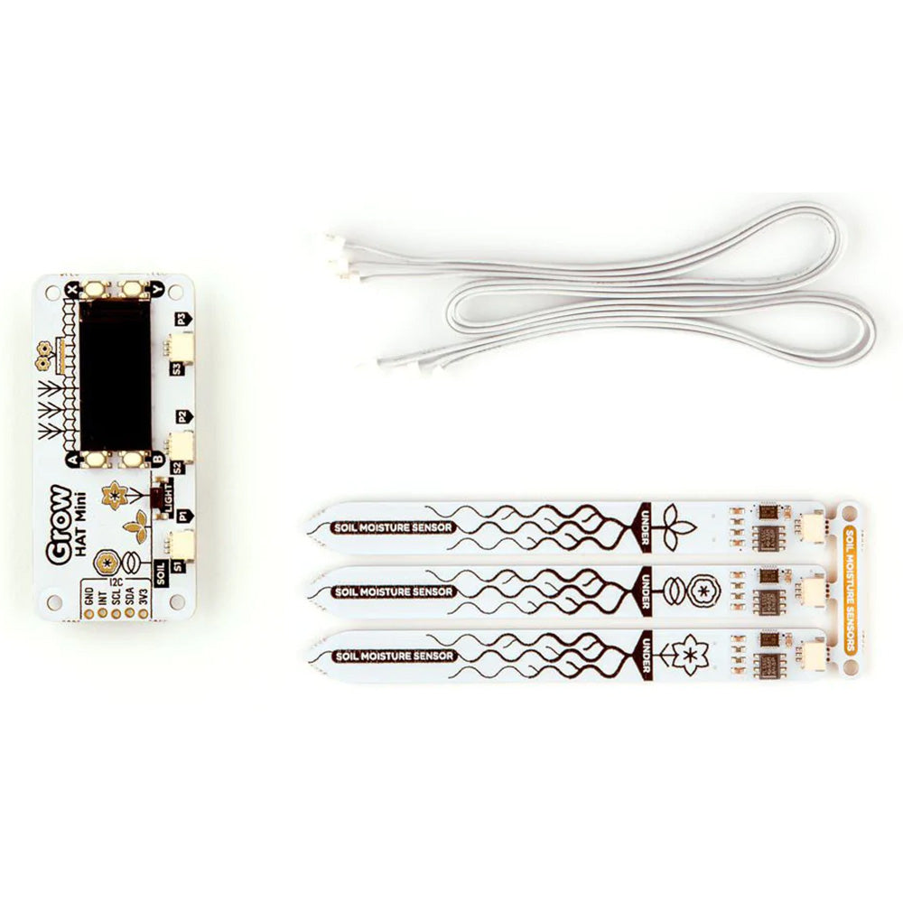 The board features a screen, 4 x navigation buttons, a buzzer, light/distance sensor, 3 x connections to capacitive moisture sensors, I2C connections, and 3 x connectors for controlling 5V low current devices, such as; pumps, motors, valves, solenoids or lights. Included with the board are 3 x moisture sensors and 3 x 35cm moisture sensor cables.