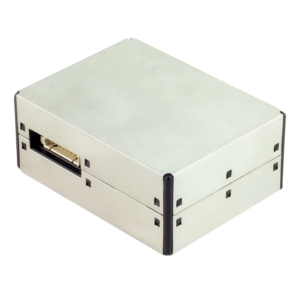 The sensor features a small fan which pulls air past a laser. The laser can detect both the size and number of particles in the air. It is important to note that there is a blue protective film that covers the metal casing of the sensor, peel this off before use.
