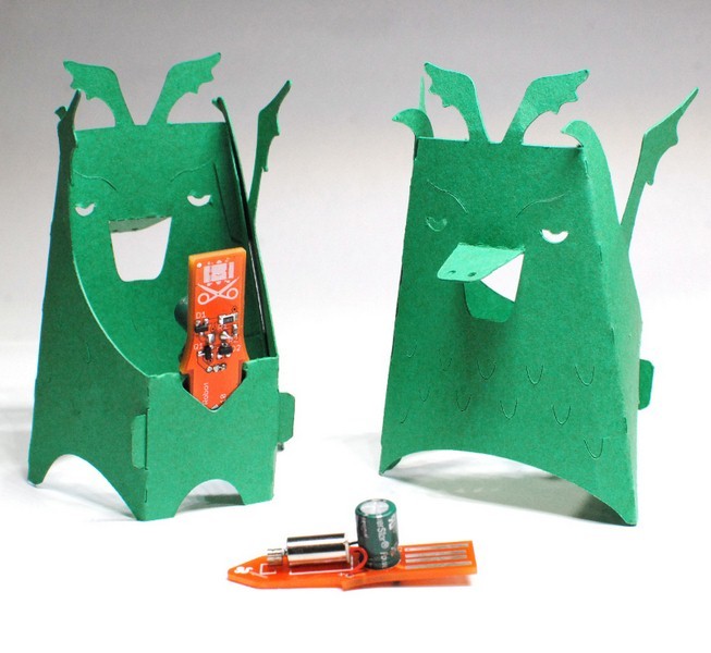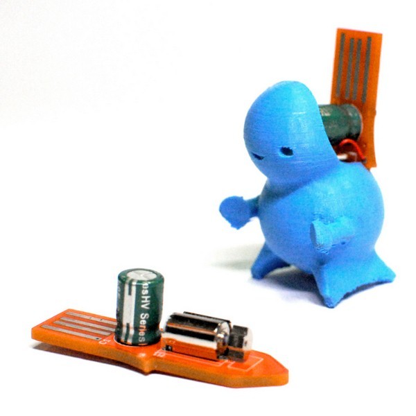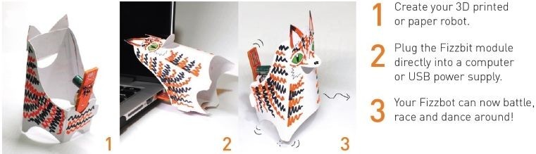 The Fizzbit, designed by The Crafty Robot, is a way to bring movement and excitement to mini-figures of your own invention. It is a small module containing a vibration motor, supercapacitor and USB plug, which can plug directly into a computer or USB power supply (no batteries required). You slot your Fizzbit into a mini-figure (made from paper or 3D printed), turning it into a Fizzbot.