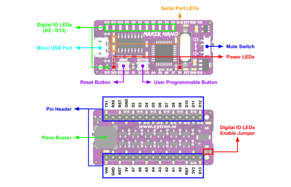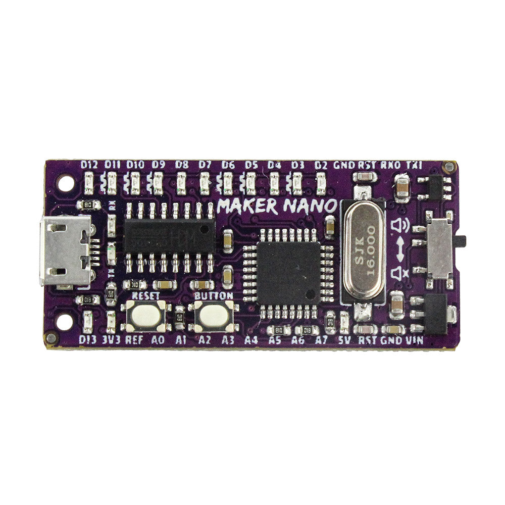 - With the help of 12 x LEDs, 1 x programmable push button and 1 x piezo buzzer, you can start coding and have some fun experimenting with Maker Nano right out-of-the-box without the hassle of wiring up any circuit.