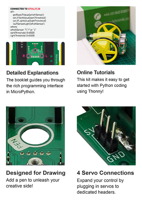 The Kitronik Autonomous Robotics Platform for Raspberry Pi Pico is a fun and hands-on introduction to buggy robotics. The easy to follow booklet provided with the kit guides you through all of the steps required for you to take control of your robot. The Robotics Platform has been designed to grow with you and provided additional servo and ultrasonic sensor connectors for more advanced projects. This buggy requires a Raspberry Pi Pico with pin headers attached, you can obtain a Raspberry Pi Pico with headers attached here.