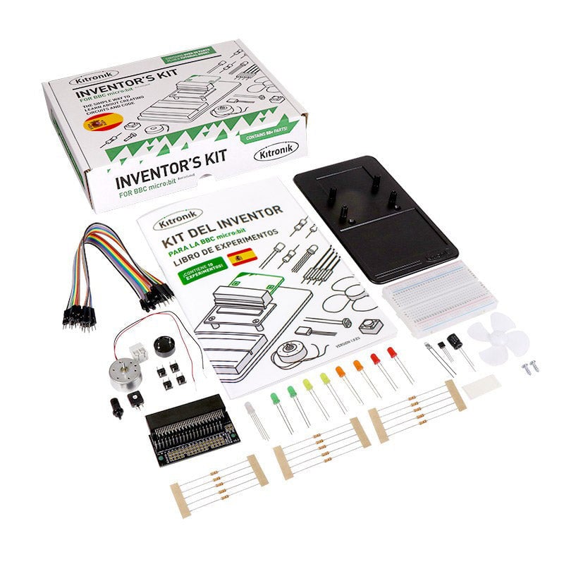 El Kit del Inventor para la BBC micro:bit is una manera fantastica para empezar a programar e interactuar con hardware utilizando la BBC micro:bit. Este Kit del Inventor contiene todo lo necesario para completar 10 experimentos usando LEDs, motores, fototransistores y condensadores.