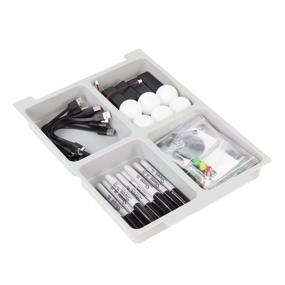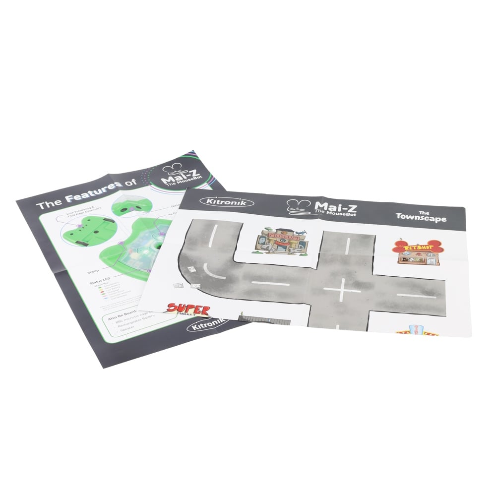 The kit is supplied with an extensive set of teaching resources that are aligned for both US & UK teaching, consisting of; Teacher/Technician/Classroom Assistant instructions, Scheme of learning, lesson plans & presentations, Student instructions & slideshows, Exclusive digital versions of resources & code examples. Each Kit comes with 11 x Mai-Z The MouseBot Floor Robots & USB-C Charging Cables, 11 x Double-sided A1 Map/Line Following Posters, 2 x A2 Features Posters, 4 x STOP:bits & accompanying switched battery holders, 11 x Sharpies, 6 x Table Tennis Balls.