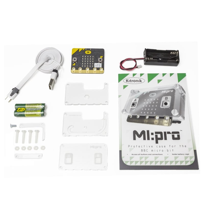 BBC micro:bit with a MI:pro protective case, a 1M anti tangle USB Cable, a Battery Cage and 2 x AAA Batteries. Your BBC micro:bit will come in one of 4 colour schemes, unfortunately it is not possible to specify which colour you will receive.