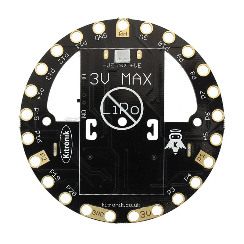 The Klip Halo V2.0 with JST has an integrated connector for 3V power, and an on/off switch. The connector is the same as on the BBC micro:bit, so BBC micro:bit battery packs will plug in. DO NOT use with LiPo batteries. The switch also turns on /off the power to the 3V connections.