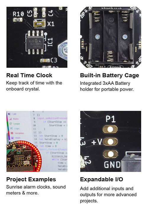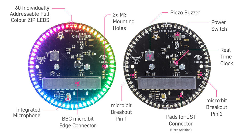 The Kitronik Halo HD board for the BBC micro:bit incorporates 60 individually addressable full colour ZIP LEDs. It also breaks out P1 and P2 to a standard 0.1” footprint, it features a MEMS microphone for detection of sound, and a piezo buzzer to play sound. If that weren’t enough, it also features an onboard real time clock (RTC) controlled by I2C lines from the microbit. The board also has two M3 mounting holes. We think you’ll agree, the board is loaded with useful features. It doesn’t stop there…