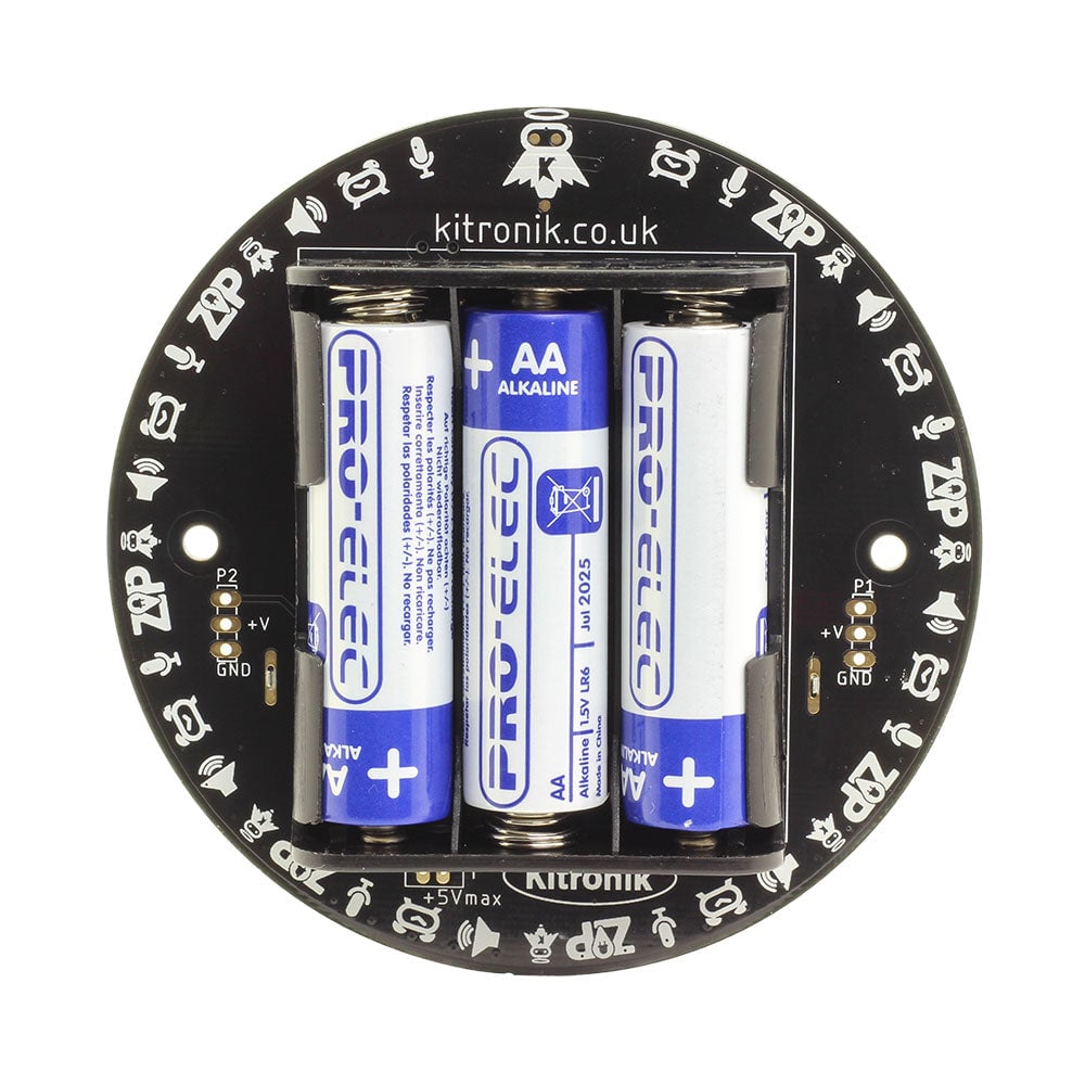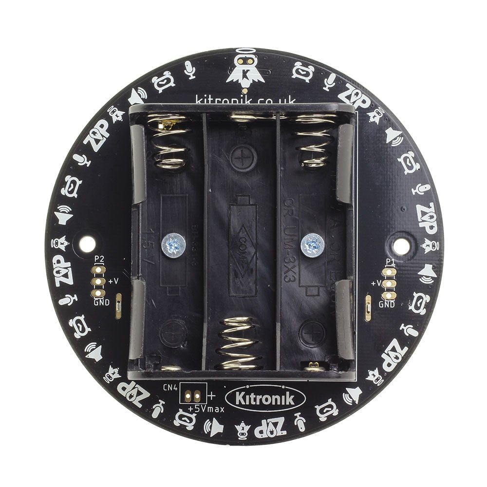 The board has a 3xAA battery holder mounted on the rear, with a power switch on the front of the board. A regulated supply is produced on the board which is fed into the 3V and GND connections to power the connected BBC micro:bit, removing the need to power the BBC micro:bit separately. See the Datasheet for more information.