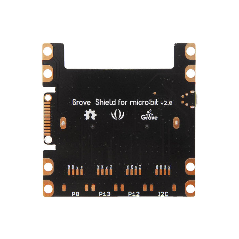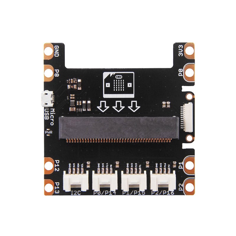 - The board breaks out; GND, 3V, P0 ,P1 ,P2 ,P12 ,P13 from the micro:bit edge connector, pins 14 through 16 and IC2 also being available via the onboard Grove connectors.