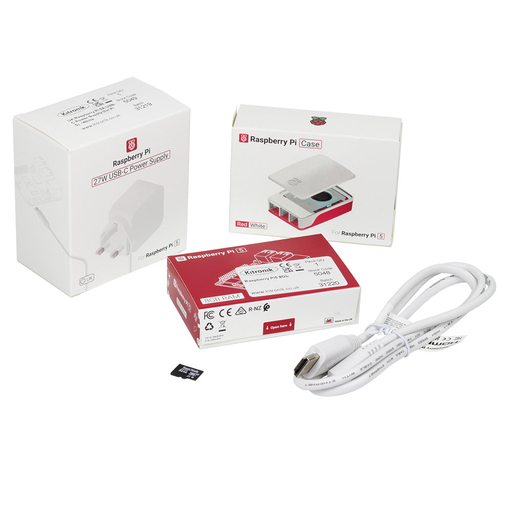 The kit comprises; A Raspberry Pi 5 (either 4GB or 8GB), a case for the Raspberry Pi 5, an official Pi power supply, a 32GB Micro SD Card for Raspberry Pi 5 pre-loaded with the latest Raspberry Pi OS, and a Raspberry Pi Micro HDMI to HDMI Lead.